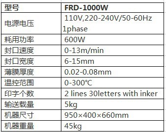 FRDl000系列固體墨輪印字封口機可以在封口的同時打印生產(chǎn)日期等文字;字跡清晰,顏色可選,且不易被擦除和更改;瞬印瞬干,換字方便。