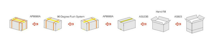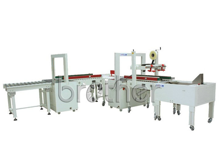 本套包裝系統(tǒng)由自動(dòng)折底機(jī),自動(dòng)封箱機(jī),全自動(dòng)捆扎機(jī),90度轉(zhuǎn)角推料輸送臺(tái)和輸送架組成,具有連續(xù)自動(dòng)封箱及多道捆扎包裝的功能,既減少占地面積,又降低包裝成本。除前部分需人工放箱裝箱外,后部分的封箱捆扎為自動(dòng)控制,工作可靠,操作方便,保養(yǎng)簡(jiǎn)單。封箱機(jī)、捆扎機(jī)也可分別單獨(dú)使用。