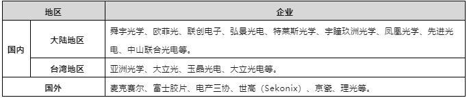 國內(nèi):舜宇光學(xué)、歐菲光、聯(lián)創(chuàng)電子、晶華光學(xué)、宇瞳光學(xué)、富蘭光學(xué)、藍(lán)思旺、瑞豐光電、中潤光學(xué)、三景科技、瑞鼎光電、藍(lán)思光電、新旭光學(xué)、寧波峰梅等。