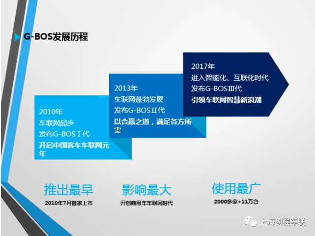 經(jīng)歷了公司成立之初的艱辛砥礪后,上海創(chuàng)程于2013年5月22日在北京上市發(fā)布G-BOS智慧運營系統(tǒng)II代,與其他類似產(chǎn)品一個顯著不同之處是實現(xiàn)了“三合規(guī)”:一是通過了公安部CCC檢測認證、交通運輸部部標認證;二是GPS/北斗雙模終端率先通過交通運輸部部標認證,成為客車行業(yè)首家;三是率先通過交通運輸部平臺符合性檢測,這也是客車行業(yè)首家。G-BOS智慧運營系統(tǒng)II代獨創(chuàng)性地提出了“帶機入網(wǎng)”的業(yè)務(wù)模式,啟動深藍計劃,與國內(nèi)各地的GPS運營商建立并展開廣泛合作,著力于解決G-BOS的落地接入問題,為G-BOS的商業(yè)運營奠定了堅實的基礎(chǔ)。