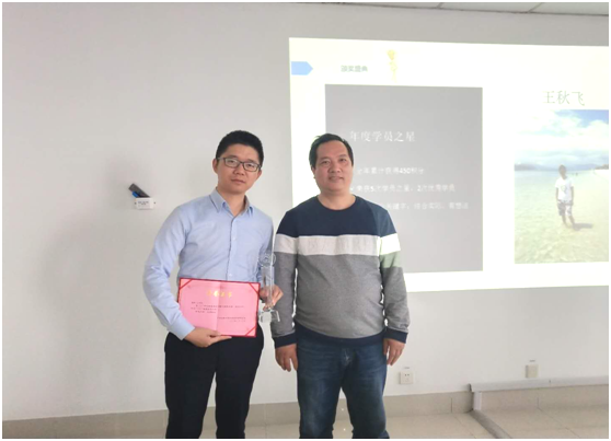 (從左向右)“年度學(xué)員之星”王秋飛、頒獎(jiǎng)人劉正山