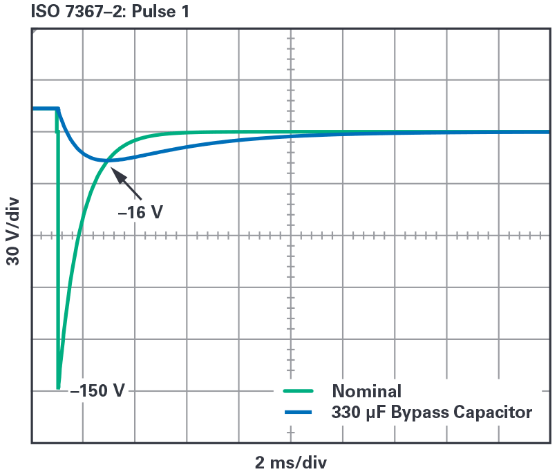 在最近的迭代中,ISO 7367-2電磁兼容規(guī)范主要介紹來自相對較高的阻抗源(2 Ω至50 Ω)的大幅度(>100 V)、短時持續(xù)(150 ns至2 ms)瞬變。這些電壓峰值通??梢允褂脽o源組件消除。圖1顯示定義的ISO 7367-2脈沖1,以及增加的330 μF旁路電容。電容將尖峰幅度從–150 V降低至–16 V,完全在反向電池保護(hù)電路支持的范圍內(nèi)。ISO 7367-2脈沖2a、3a和3b的能耗遠(yuǎn)低于脈沖1,所需的抑制電容也更少。