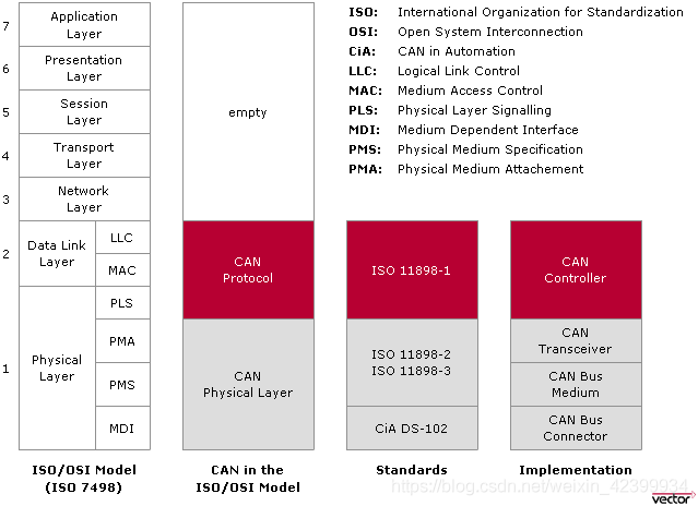 CAN底層標(biāo)準(zhǔn)都相同,涵蓋OSI模型中的物理層和數(shù)據(jù)鏈路層,與ISO/OSI模型的對(duì)應(yīng)關(guān)系如下圖所示: