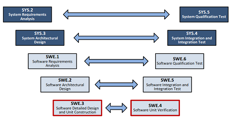 ASPICE 建立在 V 模型之上,它需要與每個(gè)開(kāi)發(fā)階段相對(duì)應(yīng)的測(cè)試階段。 這是一個(gè)嚴(yán)格的模型,需要嚴(yán)格的評(píng)估以確保持續(xù)的評(píng)估和發(fā)展。下圖是ASPICE中定義的典型開(kāi)發(fā)流程: