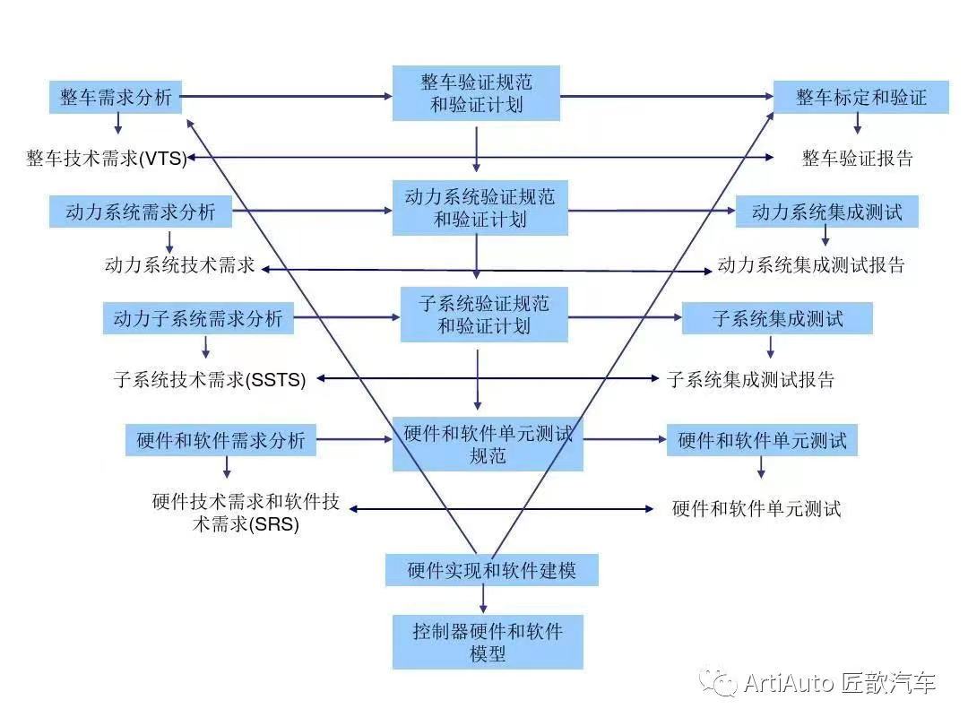 V流程來源于軟件開發(fā)過程中一個(gè)稱為快速應(yīng)用開發(fā)的模型,由于該模型的構(gòu)圖形似字母V,所以俗稱V模型。V模型是軟件開發(fā)、測(cè)試中最重要的一種模型,其大體可劃分為幾個(gè)不同的階段步驟,即功能需求、功能開發(fā)、軟件開發(fā)、軟件集成測(cè)試、功能集成測(cè)試、整車集成測(cè)試(系統(tǒng)合格性測(cè)試),如上圖所示。左邊為需求分析和設(shè)計(jì)開發(fā)的過程,右邊則為針對(duì)左邊的測(cè)試驗(yàn)證。