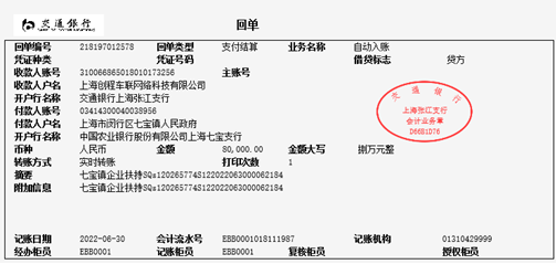 2022年6月30日,我司收到上海市閔行區(qū)七寶鎮(zhèn)人民政府企業(yè)扶持專項首筆資金8萬元,預(yù)計下半年會獲得剩余尾款7萬元。
