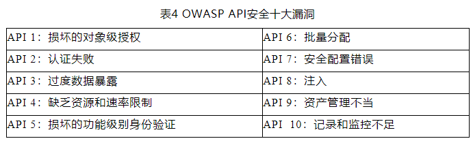 TSP是重要的車(chē)聯(lián)網(wǎng)云服務(wù),一般云服務(wù)存在的安全風(fēng)險(xiǎn),TSP同樣存在,可以參考OWASP Top 10。云端主要靠提供應(yīng)用程序編程接口(API)與其他端進(jìn)行通信,API位于應(yīng)用程序之間或者充當(dāng)處理系統(tǒng)之間數(shù)據(jù)傳輸?shù)闹虚g層,它提供了一個(gè)簡(jiǎn)單而高效的接口,用于擴(kuò)展功能和改善聯(lián)網(wǎng)汽車(chē)體驗(yàn)。API安全不是汽車(chē)網(wǎng)絡(luò)安全獨(dú)有的,更多API安全可以參考OWASP API安全十大漏洞,如表4所示。