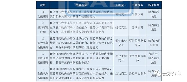 在業(yè)內(nèi)相關(guān)機(jī)構(gòu)的聯(lián)合牽頭下,其對(duì)智能座艙進(jìn)行了分級(jí),此雖并非行業(yè)標(biāo)準(zhǔn)但該舉措對(duì)于量化智能座艙的功能、統(tǒng)一并提升相關(guān)企業(yè)的開發(fā)水平有著一定作用。