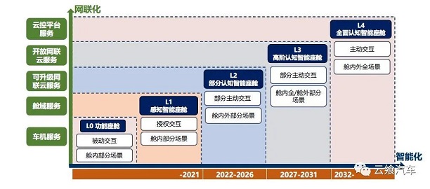 作為汽車智能化的具象體現(xiàn),在智能座艙的發(fā)展中,其路線可參考下圖的規(guī)劃,當(dāng)前智能座艙所處階段為L2。