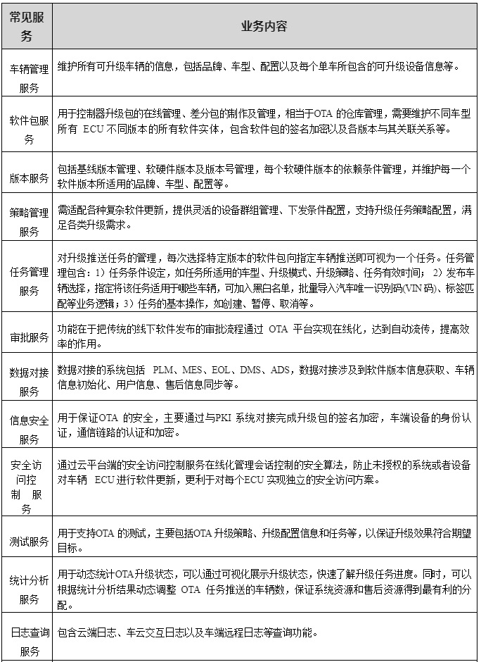 (4)業(yè)務(wù)服務(wù)層:業(yè)務(wù)服務(wù)層是 OTA 服務(wù)所有業(yè)務(wù)及相關(guān)流程管理功能在云平臺端的實現(xiàn), 除了車輛管理服務(wù)、軟件包服務(wù)、版本服務(wù)、策略管理和任務(wù)管理 5 個支撐 OTA 的核心功能外,還包括關(guān)聯(lián)系統(tǒng)審批、數(shù)據(jù)對接、信息安全服務(wù)、測試、統(tǒng)計分析、日志查詢等重要輔助功能。由于不同的企業(yè)內(nèi)部管理存在差異,云平臺所支持的輔助業(yè)務(wù)可能存在較大差異,常見服務(wù)列舉見表 2-4。