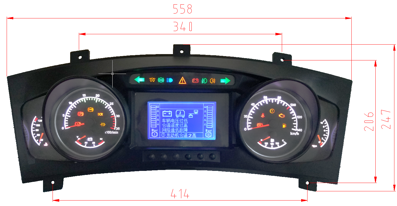 - 6個(gè)步進(jìn)電機(jī)驅(qū)動(dòng)的指針表盤 - 19個(gè)LED符號(hào)片 - 多個(gè)TFT符號(hào)片 - 5寸TFT單色屏 - 一個(gè)多音頻蜂鳴器 |